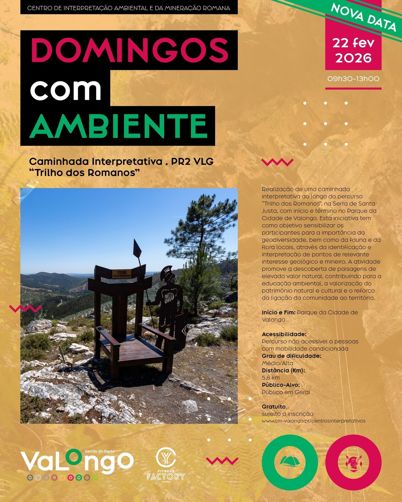 No âmbito do Programa “Domingos com Ambiente”, o Centro de Interpretação Ambiental e da Mineração Romana (CIAMR) realiza uma caminhada interpretativa ao longo do percurso PR2 VLG “Trilho dos Romanos”, na Serra de Santa Justa, com início e término no Parque da Cidade de Valongo.