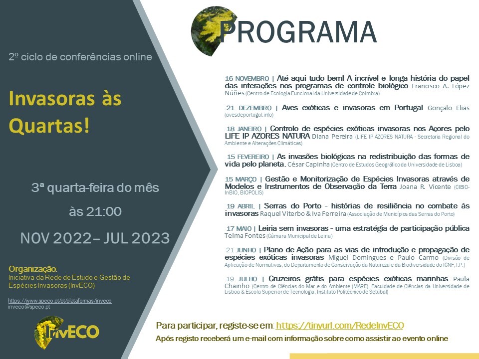 A Rede de Estudo e Gestão de Espécies Invasoras, promove o 2º Ciclo de Conferências online “Invasoras às Quartas!”, onde vários convidados, que lidam com espécies invasoras exóticas em diferentes contextos, promoverão a partilha de conhecimento e experiência. As sessões terão lugar na 3ª quarta-feira de cada mês, às 21h00, online, com a duração de 30m seguido de 20m para debate.