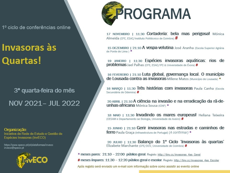 De forma a promover a disseminação e partilha de conhecimentos e experiências, bem como aumentar a visibilidade do tema e do seu reconhecimento pelos cidadãos a nível nacional, a Rede InvECO irá, ao longo de 9 sessões, reunir vários atores que lidam com espécies exóticas e invasoras em diferentes contextos.