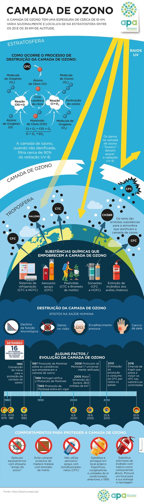 O ozono (O3) que existe na atmosfera localiza-se maioritariamente (90%) na estratosfera – camada da atmosfera entre os 12 e os 50 Km acima da superfície terrestre - observando-se as maiores concentrações a altitudes aproximadamente entre os 15 e os 35 Km de altitude, constituindo o que se convencionou chamar de "Camada de Ozono".