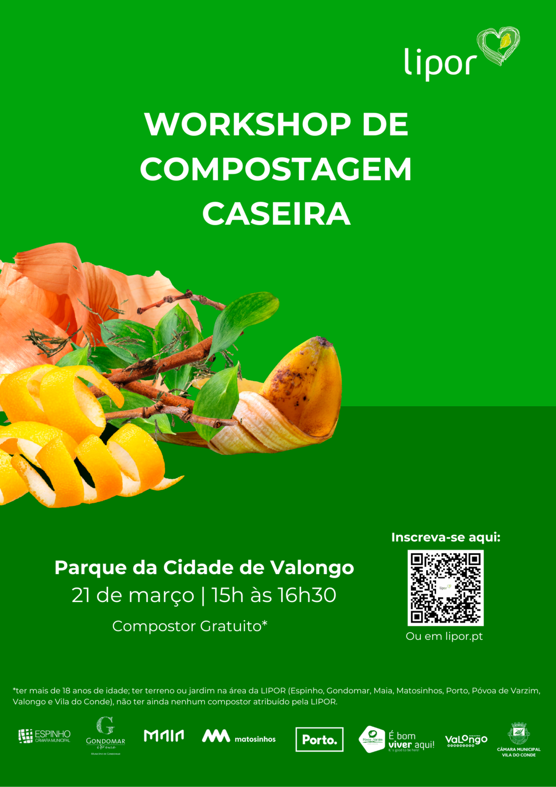 Participe no 𝘄𝗼𝗿𝗸𝘀𝗵𝗼𝗽 𝗱𝗲 𝗖𝗼𝗺𝗽𝗼𝘀𝘁𝗮𝗴𝗲𝗺 𝗖𝗮𝘀𝗲𝗶𝗿𝗮, dia 21 de março, Parque da Cidade em Valongo, uma iniciativa que faz parte dos esforços da Lipor e município de Valongo para promover a redução, reutilização e circularidade dos biorresíduos.